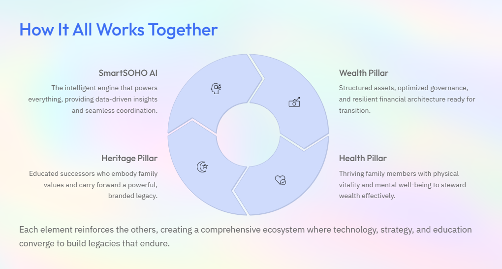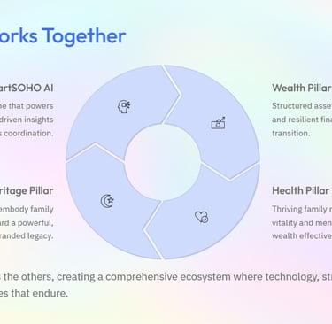 SmartLegacy Family is the modern family's gateway to a enduring legacy. We move beyond traditional wealth management by integrating our proprietary SmartSOHO AI system with holistic stewardship of your family's Wealth, Health, and Heritage. We provide the tools, education, and strategic guidance to not just preserve, but actively grow and brand your family's impact across generations.